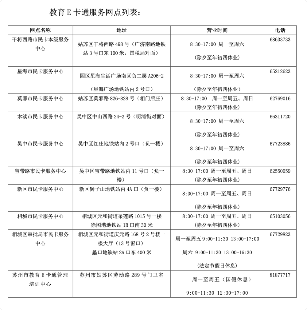地点:苏州市教育E卡通管理培训中心,苏州市姑苏区劳动路 289 号门卫室,周一至周五(国假休息)9:00-11:30 12:30-17:00。