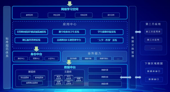 构建集身份中台、数据中台、网络学习空间为一体的数字基座,整合教育内部现有各系统,纵向贯通教育部和省教育厅、全市及各区县业务数据,横向对接苏州市政府数据中心以及各部门业务系统,立体化打破教育数据孤岛,实现用户身份的统一认证、教育数据的统一管理,提供坚实的数字化服务支撑能力。