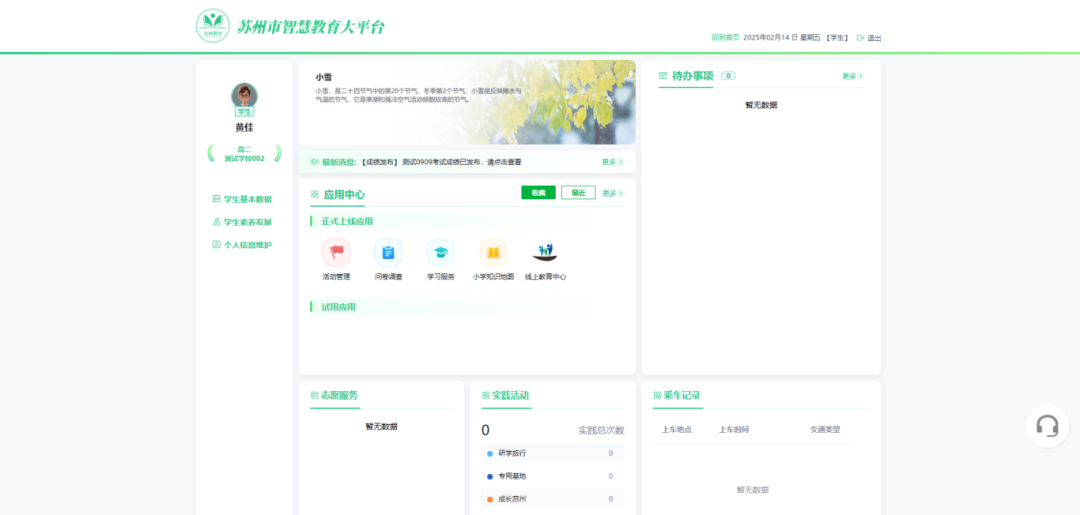 作为教育服务统一门户,集成应用系统为各类用户提供一站式服务能力,当前已接入学生健康申报系统、义务教育优质均衡发展监测系统、数字化体育卫生系统、课后服务管理系统、苏州教育E卡通管理平台、苏州线上教育中心、家长学堂等应用系统。后续将继续推进其他未接入的市级教育应用对接,不断扩大教育服务能力,提高服务水平。