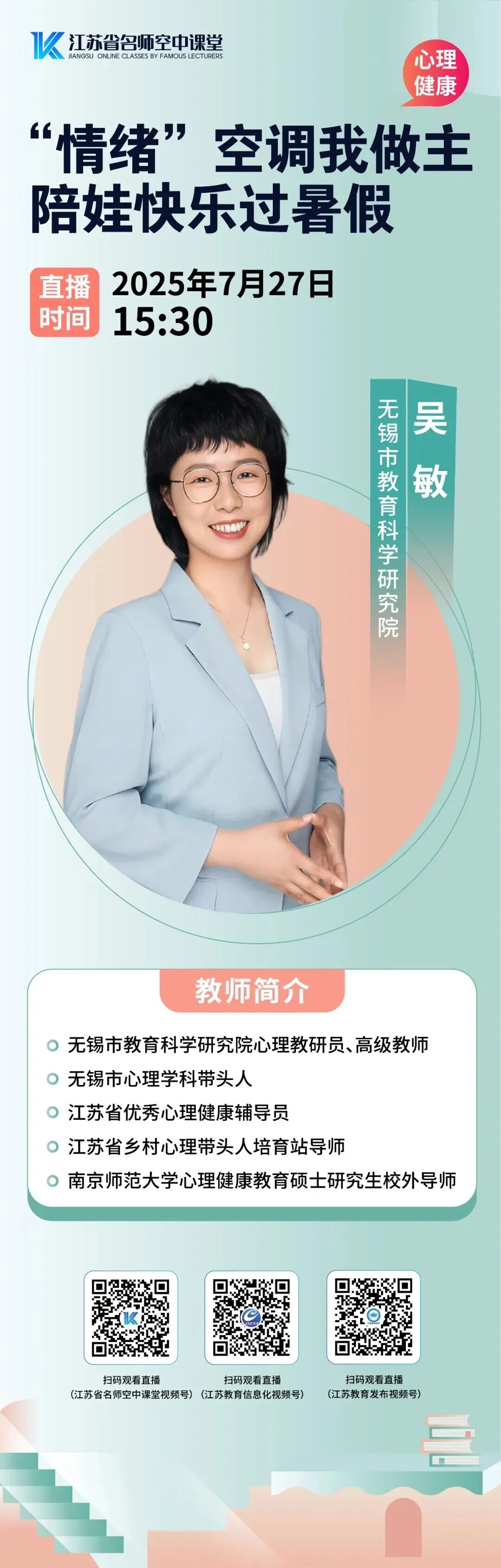 7月27日15:30,2025年“润心行动”家长课堂暑期专题第三讲将由无锡市教育科学研究院吴敏老师担任主讲——《情绪“空调”我做主,陪娃快乐过暑假》,一起跟随吴敏老师解锁 “清爽带娃” 模式吧!