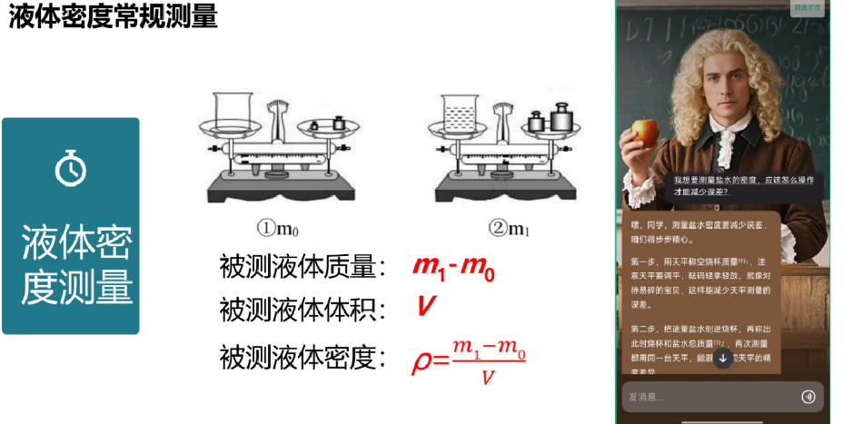 通过智慧互动提升课堂效能,课堂采用AI随机点名系统,结合“拔河比赛策略分析”等真实问题开展限时答辩,确保学生思维活跃。课后,学生通过AI智能体提问,如“在水银中测密度会怎样”,系统不仅解答,还会反问“为什么潜水艇不能用铅制作”,形成闭环设计,实现教学管理的“润物无声”。