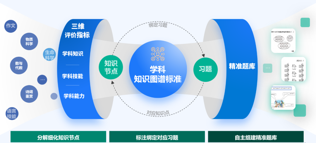 1.知识图谱筑基,让数据来源“看得见”。姑苏区依据国家课程标准,系统构建学科三维评价指标;形成覆盖全学段的学科知识图谱标准;自主组建区域精准题库,基于DeepSeek开发自动处理习题语义提取、知识节点匹配、难度系数标注的模型,实现习题与知识点智能标注。保证统一规范的数据来源,极大减轻了教师负担。(图1)