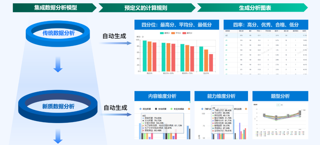 2.智能分析赋能,让精准教学“落得实”。发挥人工智能数据分析优势,自动生成基于内容维度、能力维度等多维可视化数据图表,实现学业监测分析的纵向深入。(图2)生成班级、学校、区域发展评估报告,便于教育管理者、教师横向比照,全方位了解态势,发挥数据价值,落实“精准教”“精准育”。