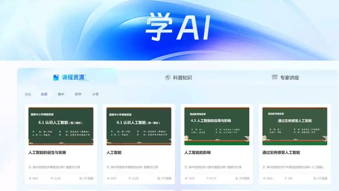 2025年,国家智慧教育平台正式推出人工智能教育频道,平台中的“学AI”板块为高中阶段提供了系统完善的人工智能课程体系与丰富的学习资源,涵盖基础教学、专家讲座,每节课还有学习任务单及课后练习,为我校的第二期人工智能教学带来了高质量的内容支持(详细实施过程见上表)。平台中“用AI”板块中的科学实验课程智能体、九章数学智能体等优质智能应用,再结合高校的师资和教学的资源补充,都为学生学习提供了便捷的实践与体验渠道。这两部分资源的引入,有效弥补了我校第一期课程体系不完善、教学资源匮乏及学习体验碎片化等问题,为后续课程的系统化与实践化发展奠定了坚实基础。