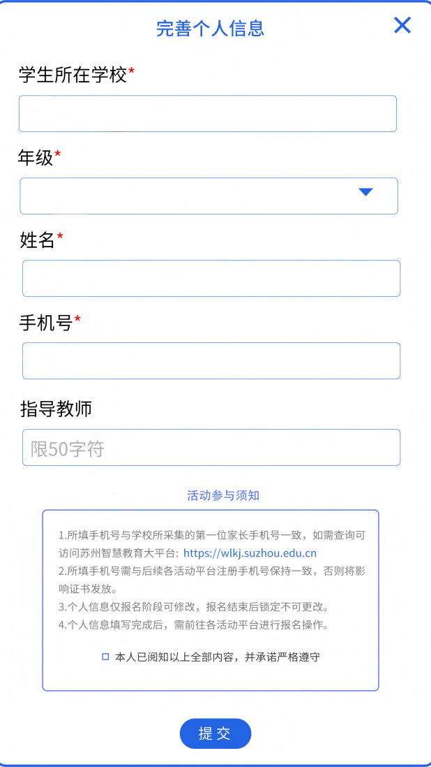 中小学生填报信息包含手机号和姓名(手机号与学校所采集的第一位家长手机号一致,如需查询可访问苏州智慧教育大平台https://wlkj.suzhou.edu.cn)。