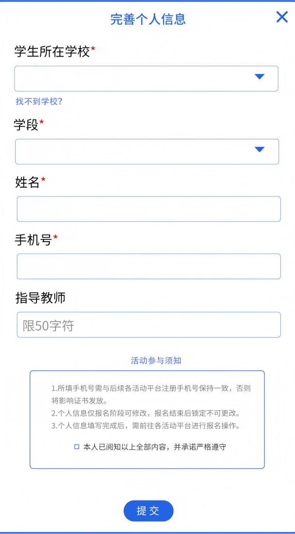 所有活动参与者登录活动专题页面后,需点击“完善个人信息”按钮,自主完成信息填报: